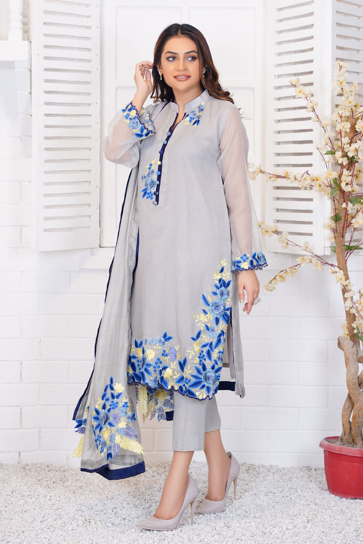 This outfit on textured organza is the perfect transition from winter to spring, with a pop of contrasting floral embroidery and 3D work.
