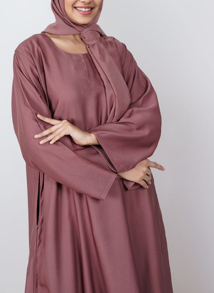Hijab Ul Hareem Tea Pink Nida Plain Round Neck Front Close Abaya - 0120-P