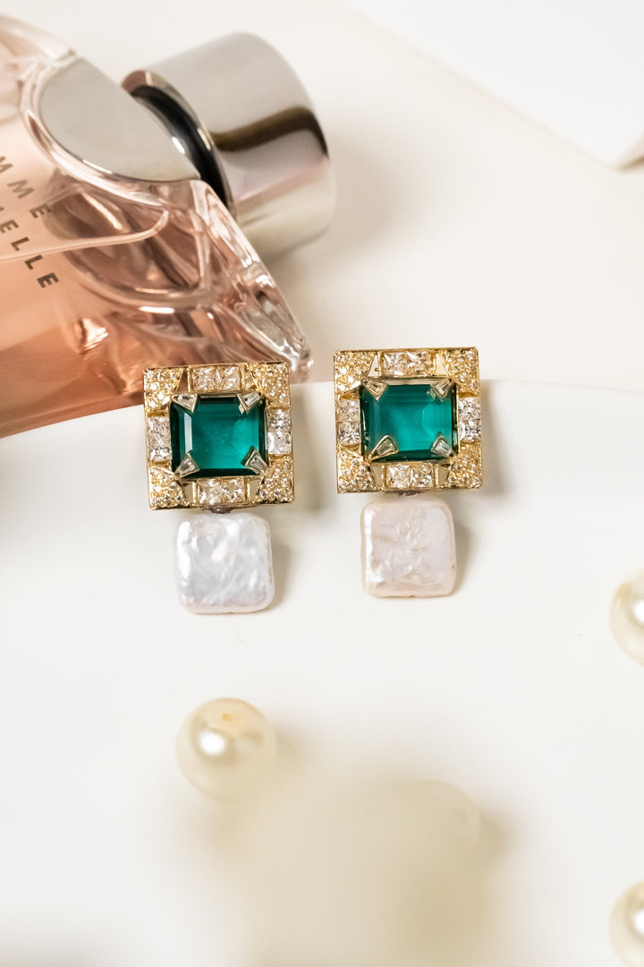 A perfect combination of square freshwater pearls and teal crystals. The golden stone setting around the teal stone gives it the sparkly bling. Dress up or down, these would go with both the looks. Theses earrings can be paired with the teal mousse bracelet and ring.