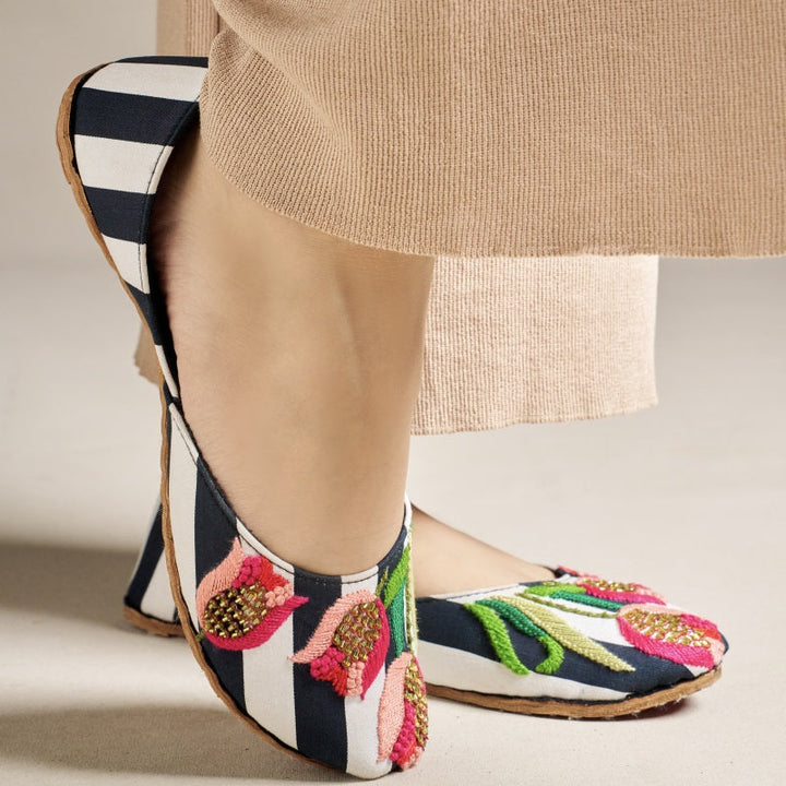 Introducing our exquisite Floral Embroidered khussas, a perfect blend of comfort and style. These khussas feature a vibrant floral embroidery on a chic black and white striped canvas, making them a standout addition to any wardrobe. The intricate floral design showcases a mix of red, pink, and green hues, adding a touch of elegance and femininity. Crafted with a soft, cushioned insole, these juttis ensure all-day comfort, making them ideal for both casual outings and formal events. The slip-on design allows for easy wear, while the durable sole provides excellent grip and support. Elevate your footwear collection with these beautiful and versatile juttis, designed to complement any outfit with a pop of color and sophistication.