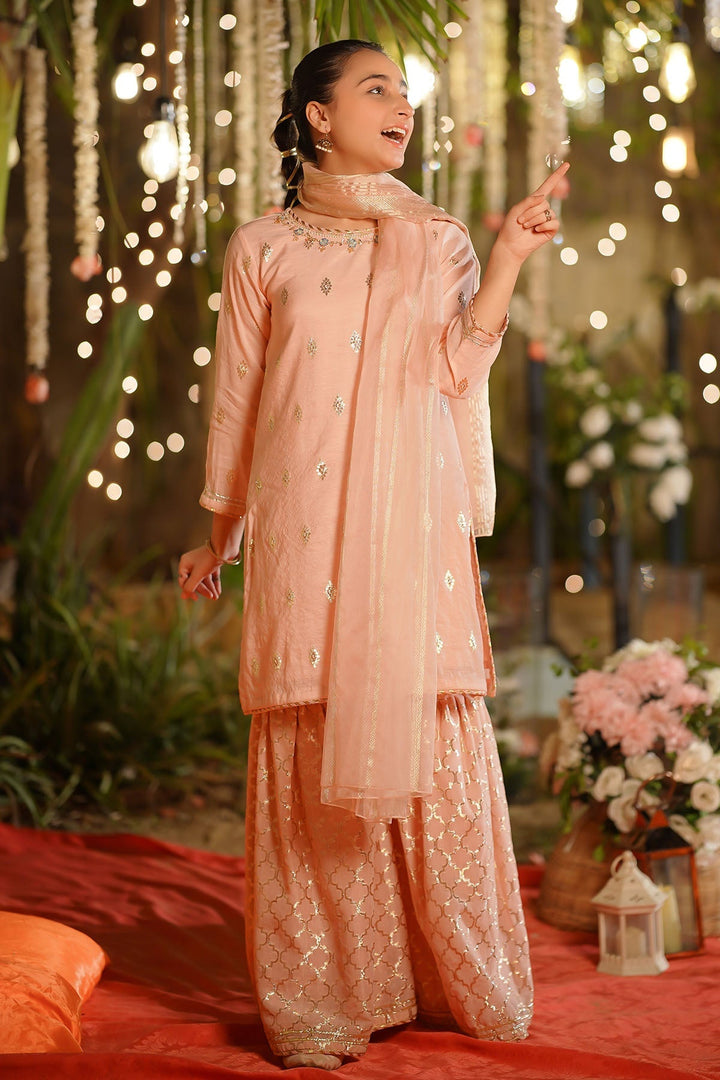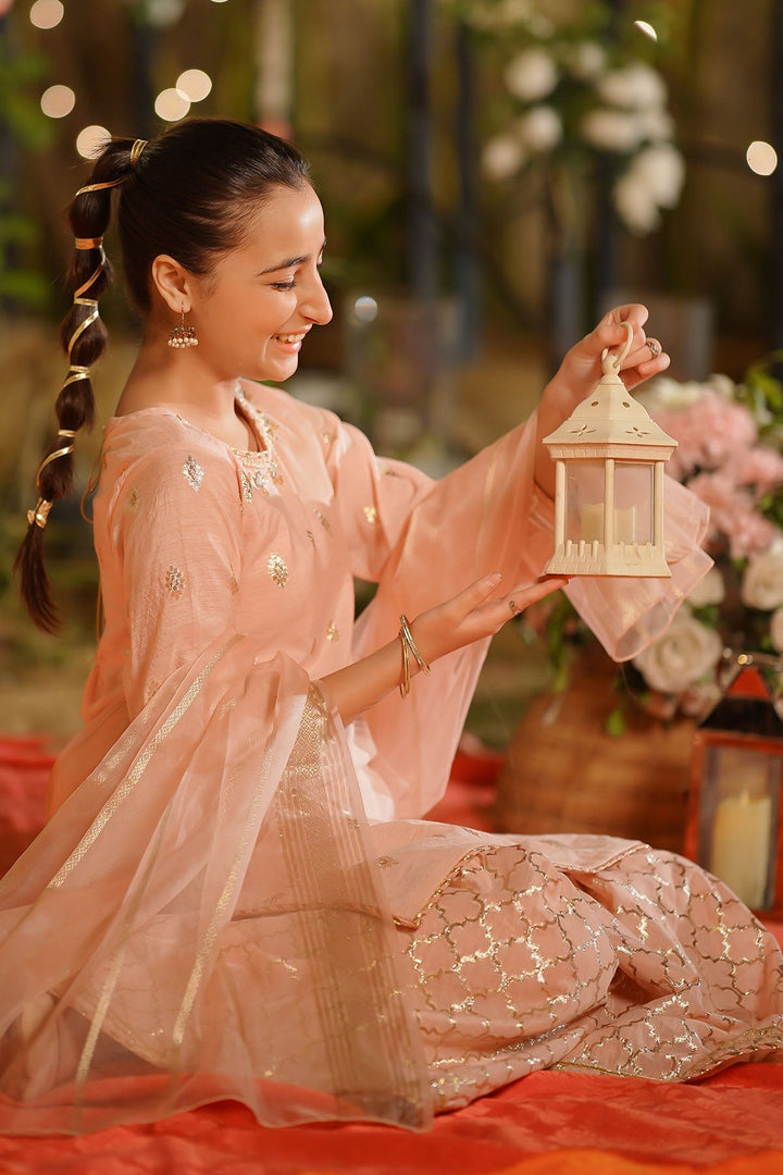 Bottom: Peach Viscose Jacquard Gharara Pants with Laces