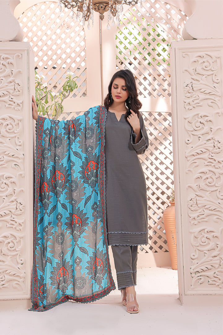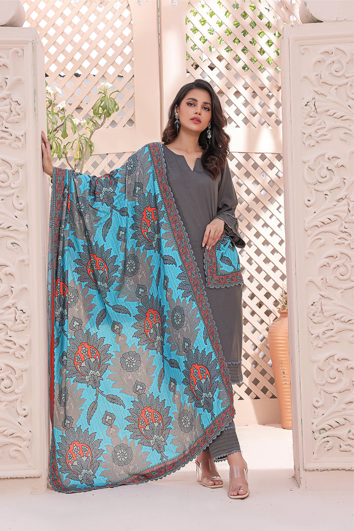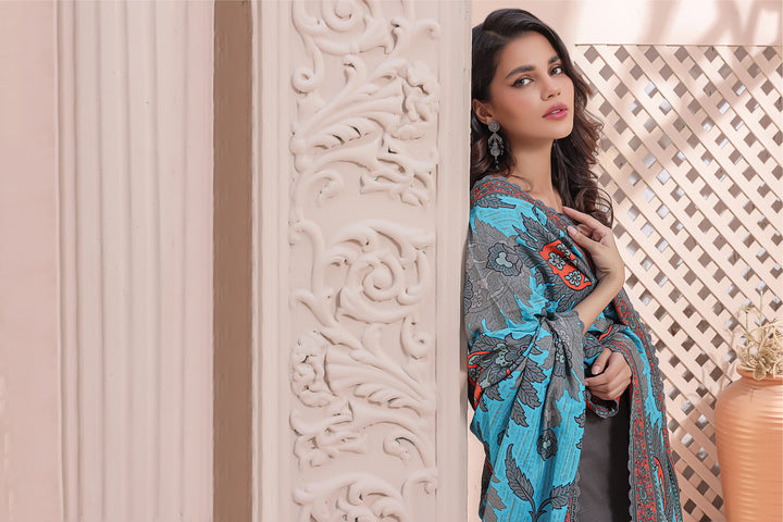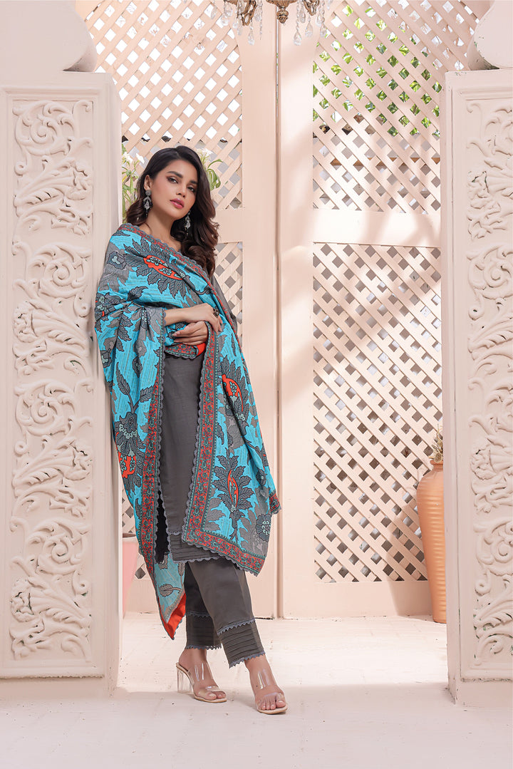Experience an exquisitely (Unstitched) Digital Printed Karandi shawl with a plain dyed khaddar suit for a new go this winter season.The article includes:Digital Printed Karandi Shawl: 2.5 yardsPlain Dyed Khaddar Shirt & Trouser Fabric: 5.4 yardsDISCLAIMER: COLORS MIGHT APPEAR SLIGHTLY DIFFERENT DUE TO THE PHOTOGRAPHIC/LIGHTING EQUIPMENT USED. SOME ACCESSORIES/EMBELLISHMENTS USED ARE ONLY FOR SHOOT PURPOSES AND NOT PART OF THE ACTUAL SUIT.