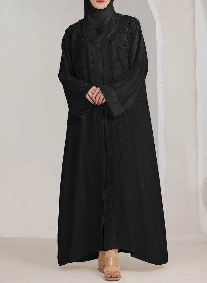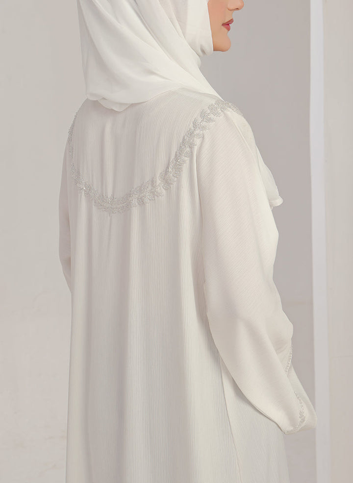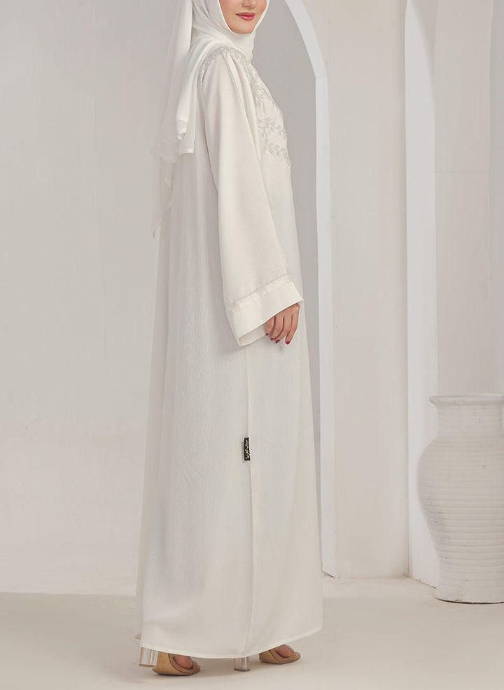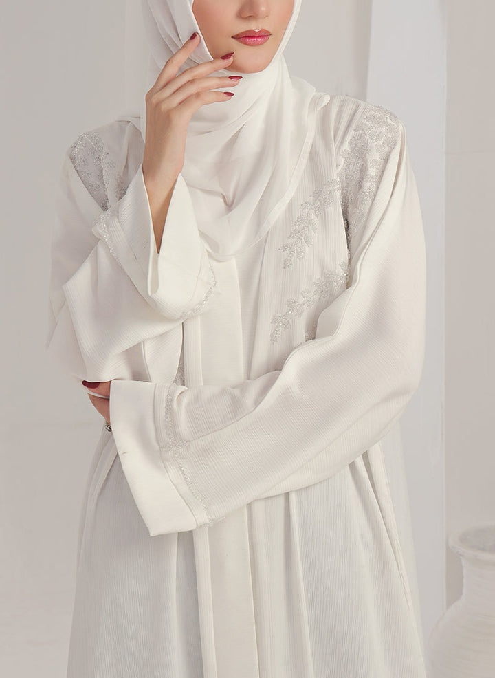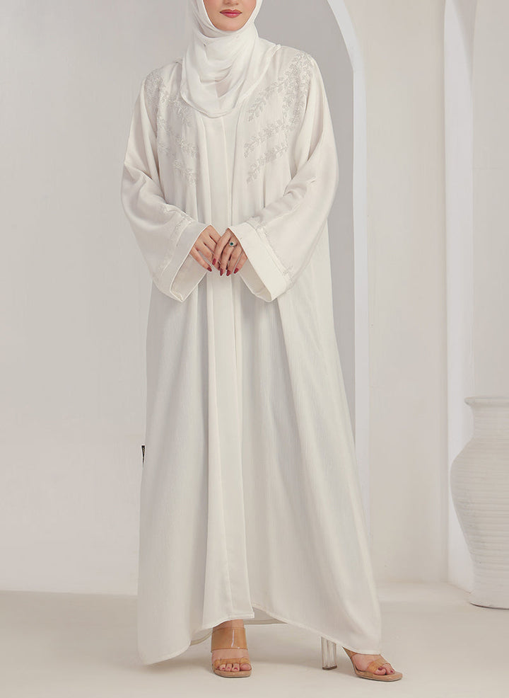 Elevate your wardrobe with this breathtaking White Hand Work Abaya. A perfect blend of tradition and contemporary style, It's perfect for looking elegant and feeling comfortable.