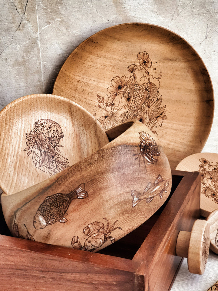 The detailed etching creates a sense of movement, with the koi appearing to glide gracefully along the curved surface of the bowl. The natural wood grain enhances the organic feel of the piece, adding warmth and depth to the artwork.