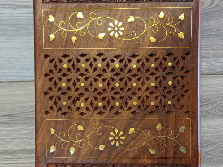 \nImagine a wooden box crafted with minimalist elegance, adorned with delicate floral inlay and subtle boho decor elements. This box seamlessly combines functionality with artistic charm, making it an ideal piece for storing jewellery or cherished trinkets. The intricate floral carvings add a touch of natural beauty, while the minimalist design ensures it fits effortlessly into any decor scheme. Whether placed on a bedside table, dresser, or shelf, this box brings a hint of hippie chic to any space.\n\n- Handcrafted wooden box with minimalist design\n- Delicate floral inlay adding a touch of elegance\n- Subtle boho decor elements for a unique aesthetic\n- Perfect for storing jewellery or other small treasures