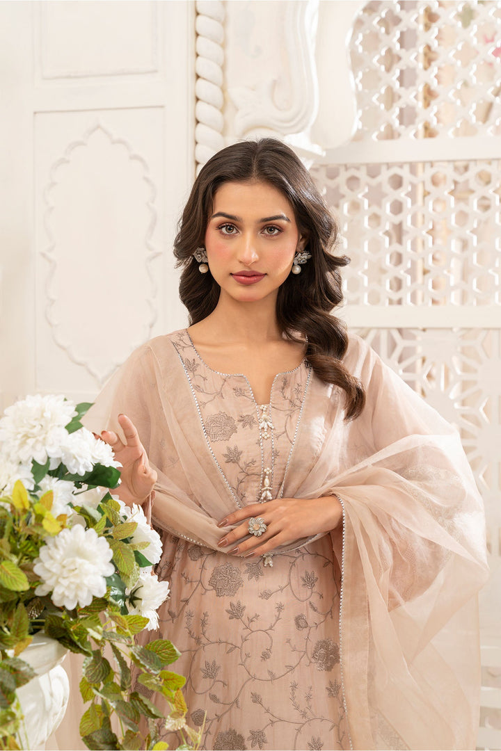Additional Description: Ethereal Elegance in Coffee Beige – This exquisite 3-piece raw silk ensemble is adorned with intricate embroidered motifs on the front, delicate silver borders on the daman with pleats and zari stitch lines, and a neckline featuring elegant pearl buttons. The embroidered sleeves are beautifully finished with organza pleats and lace details, while the trouser mirrors the sophistication with pleats and lace accents. Completing the look is a dupatta with an intricately embroidered border, making this ensemble a perfect blend of grace and timeless charm.
