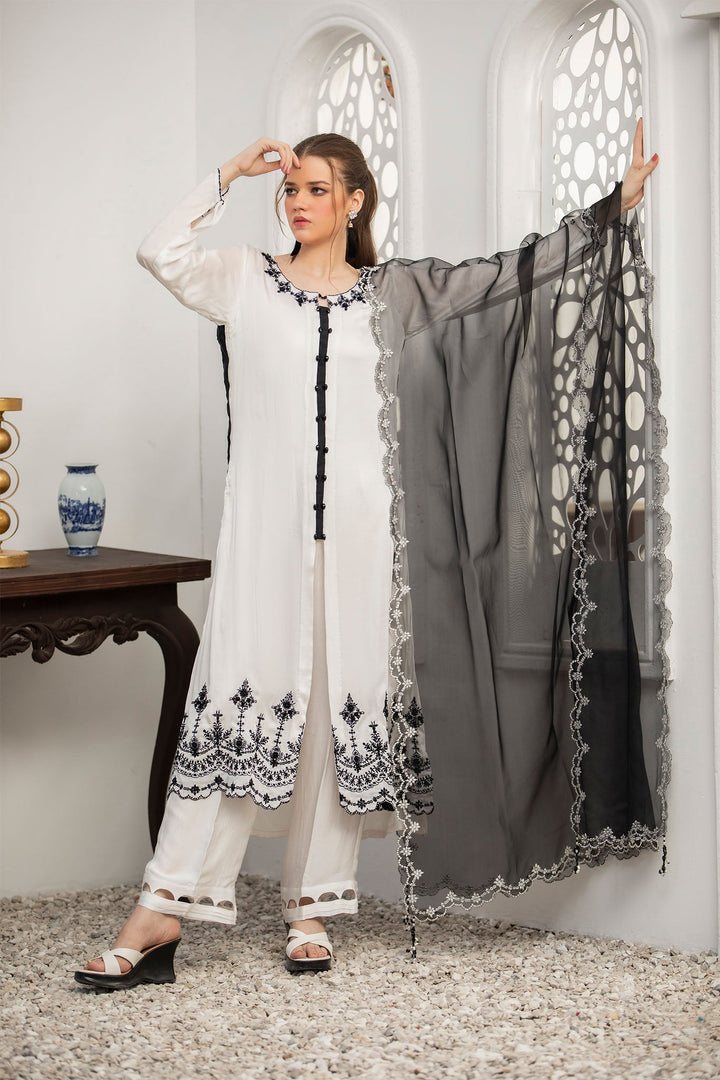 Additional Description: Elegant Monochrome Affair: Step into Glamour with our Ready-to-Wear 3-Piece Formal Ensemble. The classic combination of white and black takes center stage, featuring a silk shirt and trouser. The front open shirt is adorned with intricate embroidery on the neck and daman, embellished with adda work for a touch of opulence. The front is joined with black fabric, while the sides elegantly come together with black fabric detailing. The back of the shirt showcases a stylish cut with a pleat, adding extra flare to the ensemble. The straight sleeves feature embroidery and adda work, adding a sophisticated touch. The silk pant is tailored with pleats and scallops, enhancing the overall elegance. Complete the look with the embroidered organza dupatta, featuring beautiful handmade tassels, adding a refined finish to this evening wear ensemble. Embrace the charm and sophistication of this monochrome masterpiece for your special occasion."