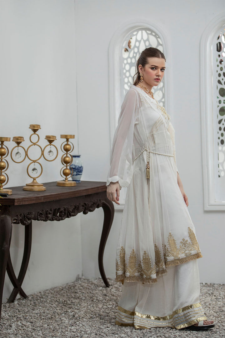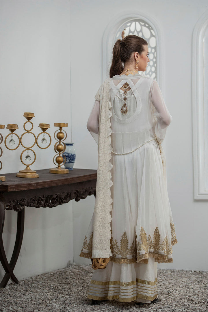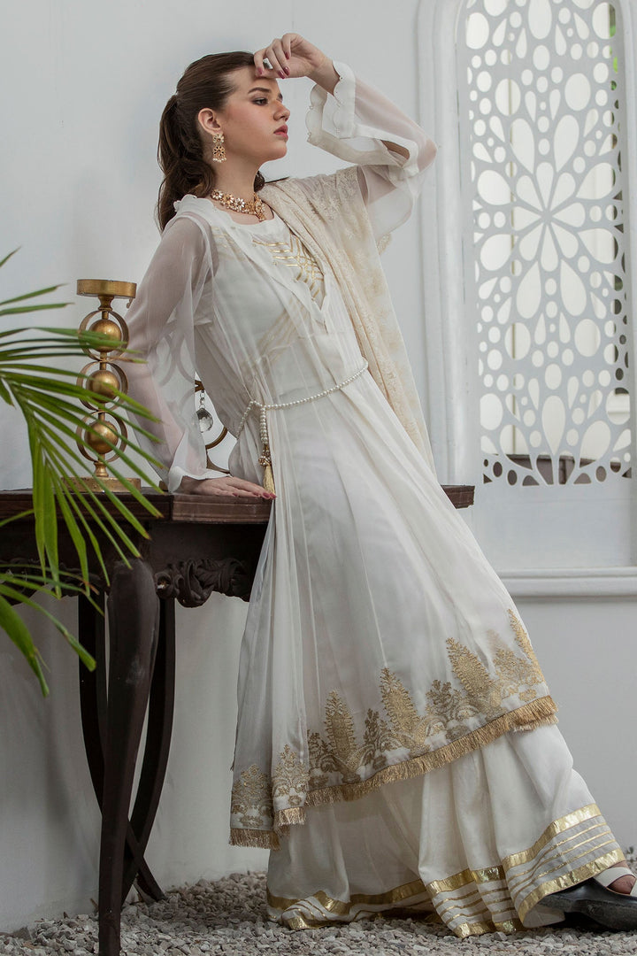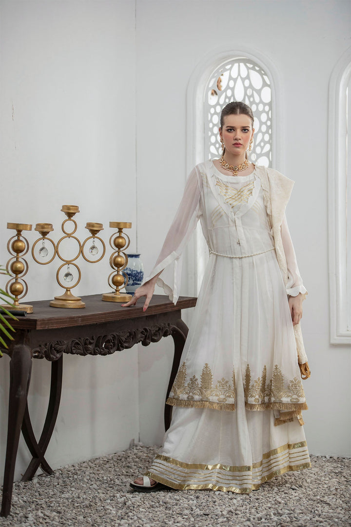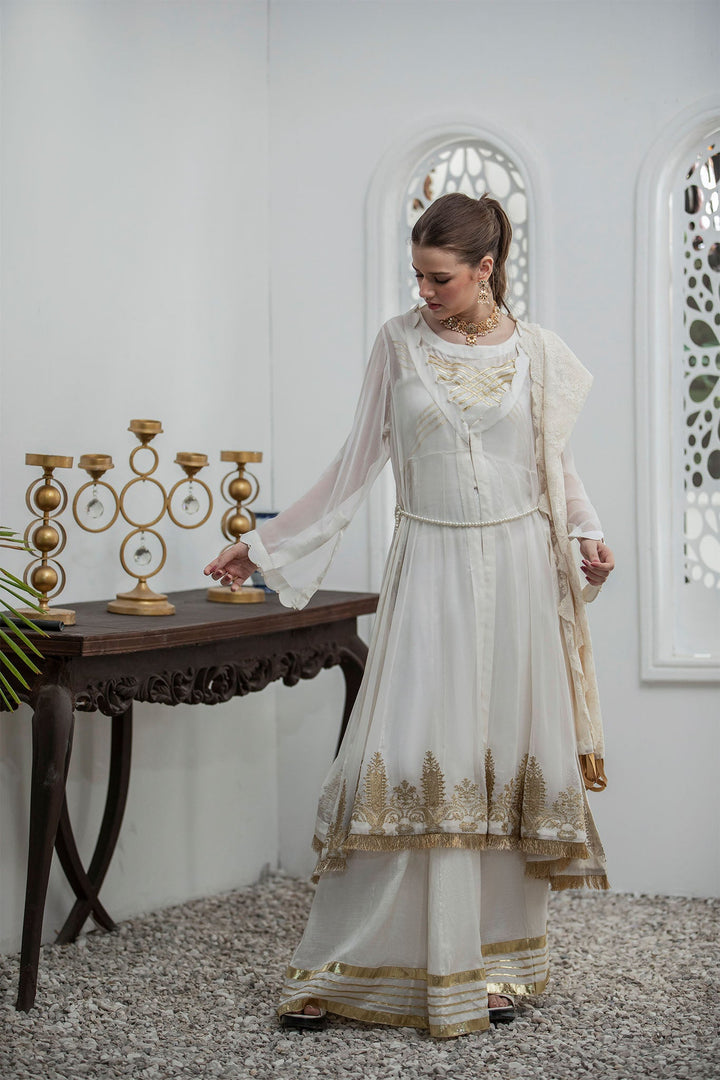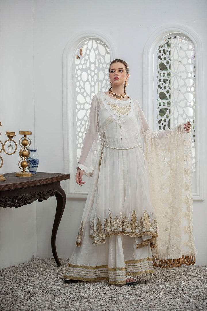 Additional Description: Exquisite Elegance in Offwhite: Indulge in Opulence with our 4-Piece Ensemble crafted from a combination of chiffon, cotton silk, net, and raw silk. The panelled skirt and open-cut panelled frock create a breathtaking silhouette. The scalloped drop neck with pearls finishing adds a touch of grace and sophistication. The body is seamlessly attached with panels, creating a seamless flow. Intricate embroidery adorns the front and back of the frock, accentuated by kiran gota lace, exuding a sense of timeless beauty. The sleeves feature a beautiful cut and pearls detailing, adding a touch of glamour to the ensemble. A drop-shaped cut at the back, embellished with a jhumka, becomes a focal point of elegance. The ensemble is further enhanced by a handmade belt adorned with tassels and pearls, adding an extra layer of charm. The bodice is beautifully crafted with dhanak detailing, adding a touch of intricacy. The panelled skirt showcases gota patti and dhanak lines on the bottom, creating a stunning visual impact. The full embroidered dupatta features loops and scallops made of lama fabric, adding a luxurious touch. Prepare to make a grand entrance in this offwhite ensemble, radiating elegance and sophistication on any special occasion.