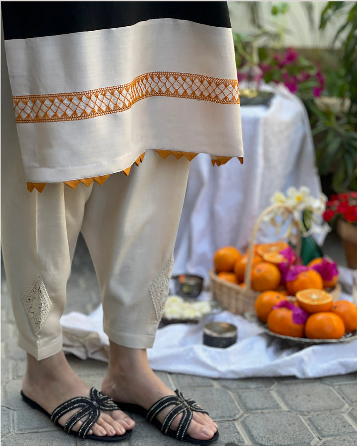 It is paired with a straight modern-cut shalwar with motif appliqué to keep the look fresh and contemporary.