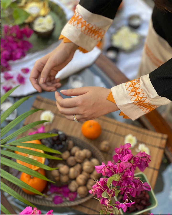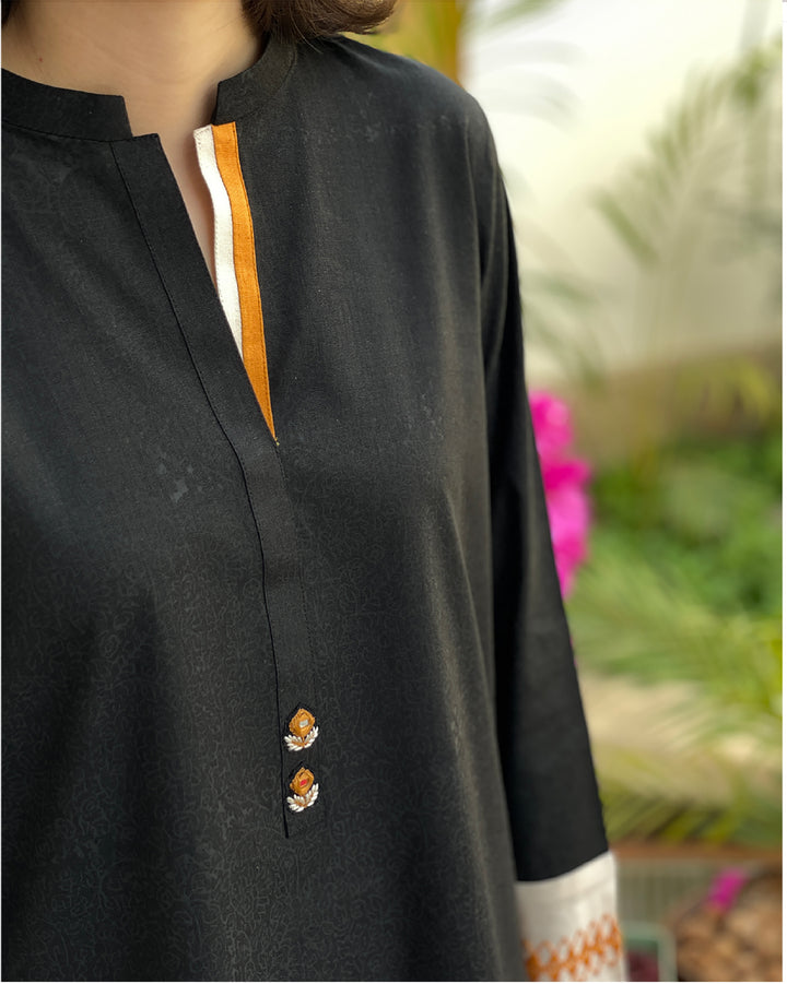 Featuring a striking black, beige, and chrome yellow palette, this ensemble boasts delicate hand embroidery on sleeves and daman. The self-block print lends a subtle texture, while the mirror work on the placket adds a touch of elegance.