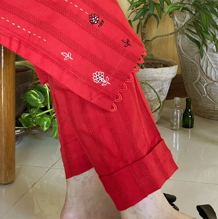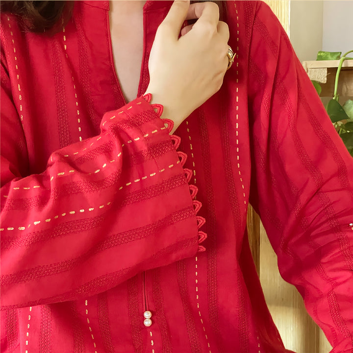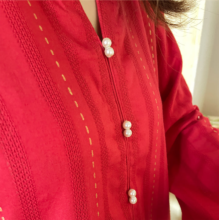 Shipping Time - 2-3weeks Neya Turn heads with this stunning summer red outfit, featuring relaxed silhouette and delicate floral embroidery. The gold block print detailing and pearl neckline adds a touch of sophistication. It is paired with a matching separate to finish the look. Disclaimer * The fabric pattern/laces, patchwork, and embellishments may vary! * Length will vary according to the design. * Actual colors of the outfit may vary from the colors being displayed on your device * Most of our products are handcrafted, please do not soak or rub. Dry Clean Only. Please note we have a ‘no exchange, no refund’ policy. Please ensure the size ordered is correct.