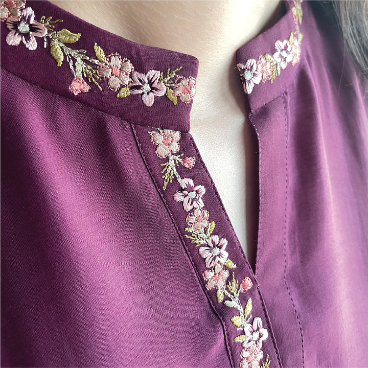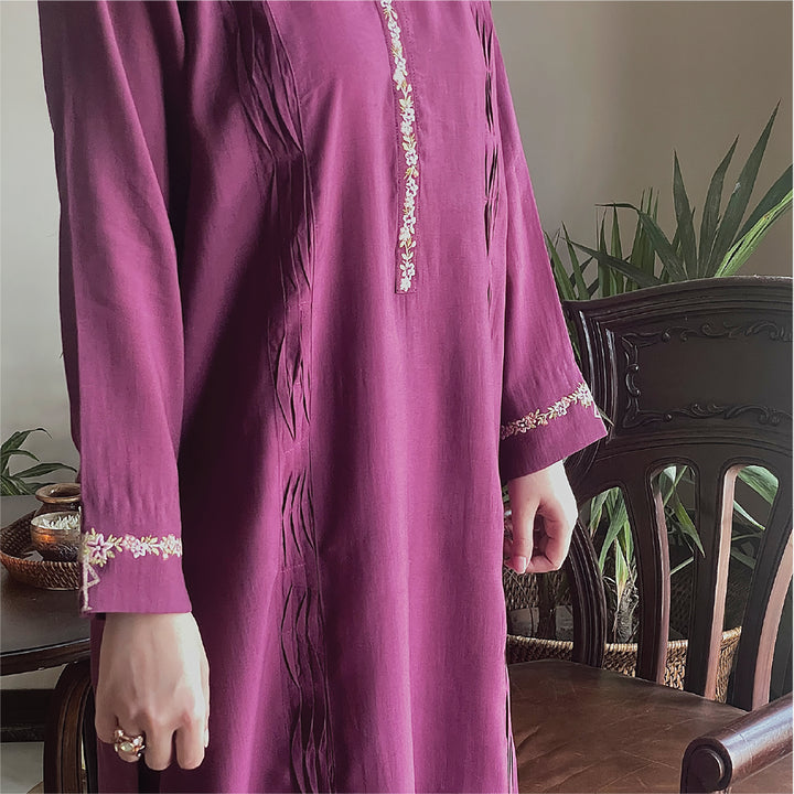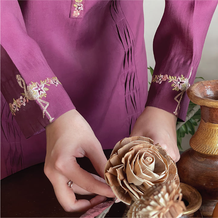 In a luxurious plum shade, this kurta boasts intricate pleating on its panels, creating a flattering silhouette. The delicate embroidered floral vine and flamingo motifs bring a modern twist to the traditional attire, making it a standout piece for any wardrobe.