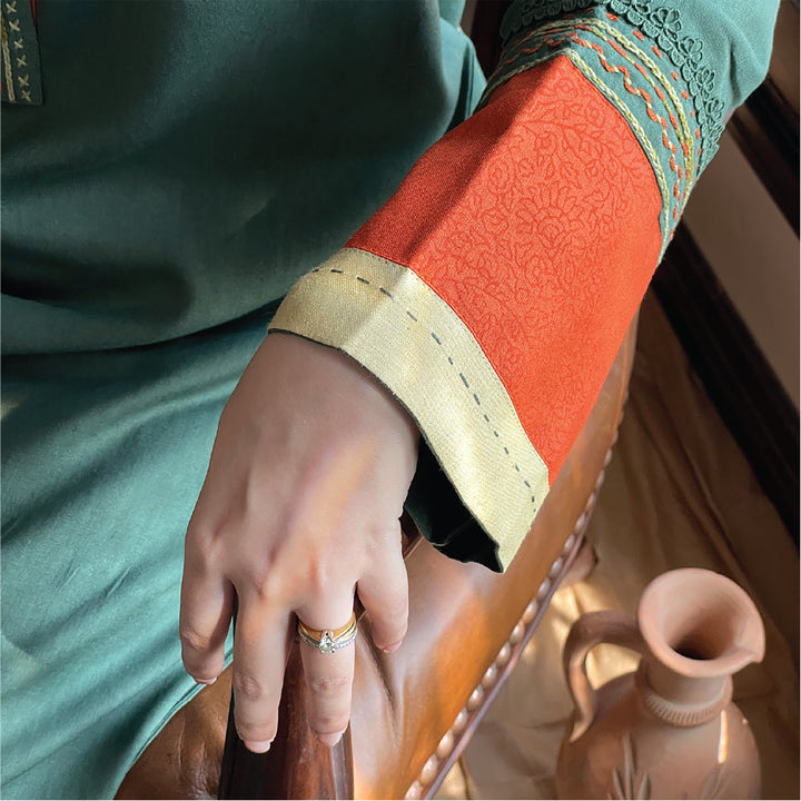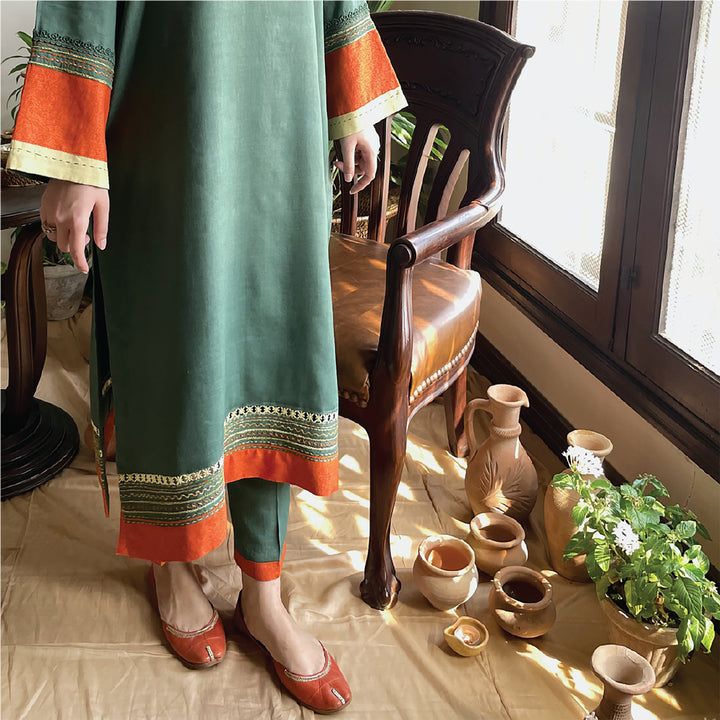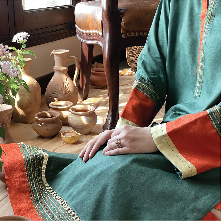 This khaddi cotton kurta is a timeless piece that every wardrobe needs. Hand embroidery adorns the garment, showcasing intricate craftsmanship and attention to detail. The striking block print border adds a unique finishing touch that enhances its overall charm. Matching pants complete the look, making it perfect for both casual and festive occasions.
