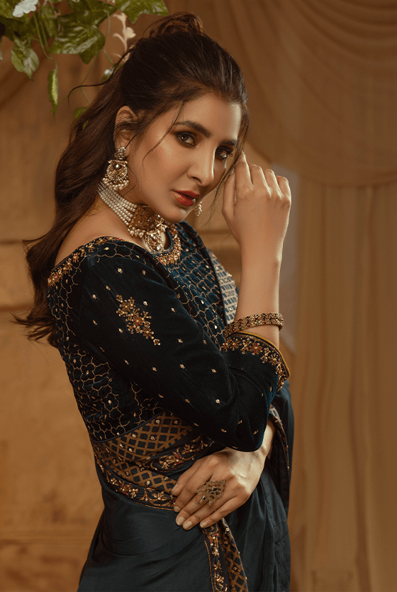 It is hand embellished with kora, dabka and zari with the accent of hot pink and dhaani, draped to perfection in varying hues of teal, giving it a timeless and elegant look.