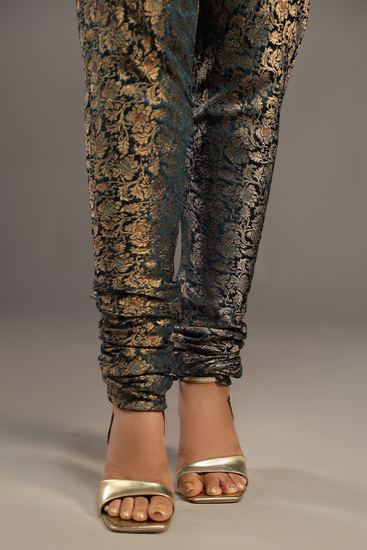 "Aysel" a teal shirt enhanced with hand embroidered sequins and resham work. The neckline is adorned with buttons. It paired with banarsi churidar and tissue silk dupatta finished with velvet borders and gold trimmings.