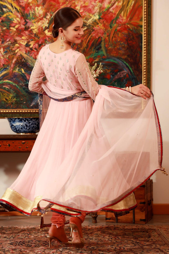 'Boohey Barian' is a Ready To Wear Three Piece Women Formal Dresses blush pink pishwas. It is a long flared frock with handwork of banarsi and silver on the body and sleeves with deep pink applique along with cutwork and the daaman is finished with golden lace. The outfit is paired with matching churidar and dupatta, finished with deep pink and blue banarsi.