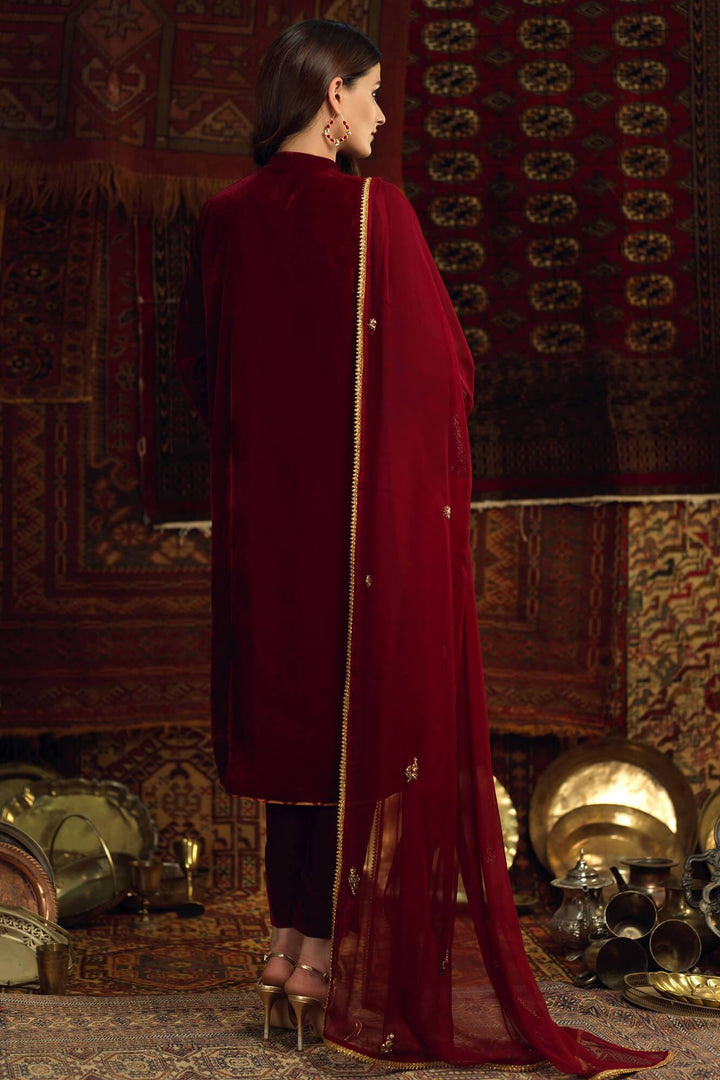 "Daneen" is a sleek and glistening outfit of velvet in maroon with classy zardozi work of kora, dabka, aari and zari. It has an exquisite half band collar neckline and slit open sleeves. Complimented with a matching chiffon dupatta with handwork and lace finishing for all festive events or evening soirees. It is paired with maroon velvet pants.