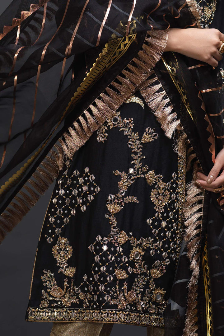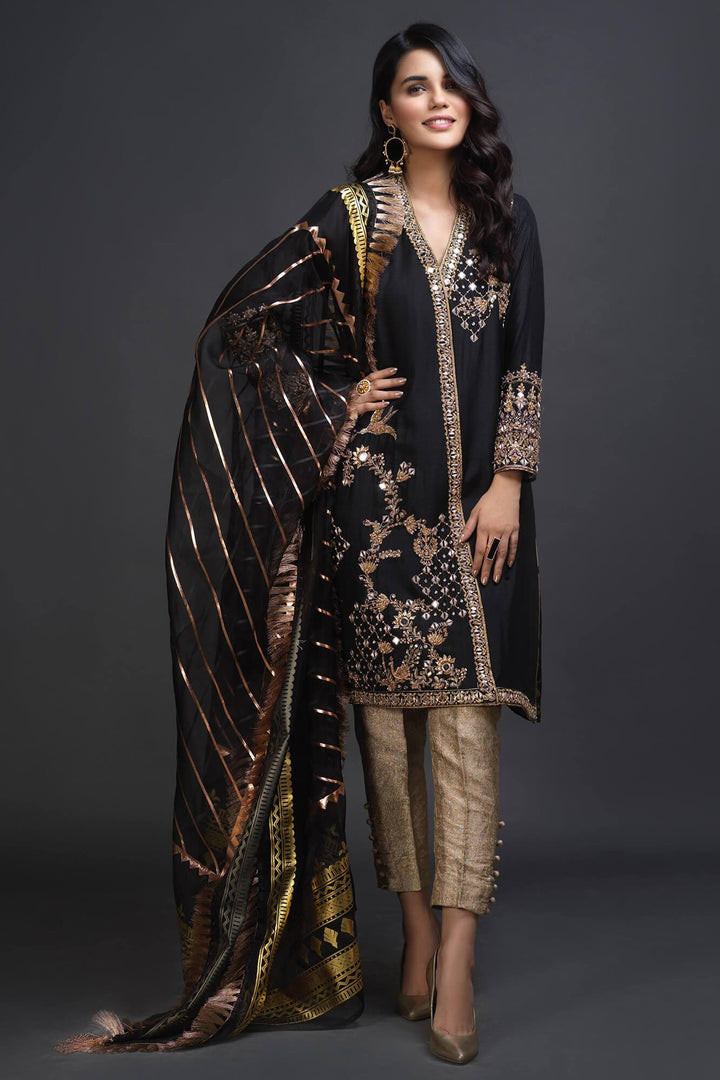 "Dehr" Zaaviay?s densely embellished modern classic Pk Raw Silk formal shirt, is a beautiful blend of kora, dabka, aari, zardozi, zari, sheesha and gota work on a black base with floral and geometric patterns; having pure kataan silk screen print finishing. It is paired with our signature style pure Organza Silk foil printed dupatta with geometric patterns or black chiffon hand embellished dupatta finished gracefully with gold fray lace.