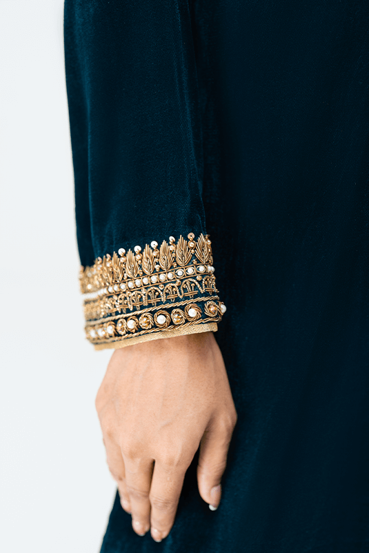"Elmas" a teal shirt with hand embellishments on neckline and sleeves. It is handcrafted  with intricate dabka, kora, pearl and sequins. It is paired with embroidered matching velvet Izaar pants and tissue silk duptta with chan overall.