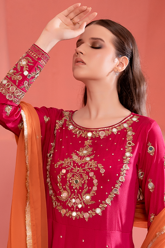 'Erem' is a Fuchsia pink is a perfect dress for any festive. This peshwas with hand embellishment designed detail with kora, babka, sequence and Peral, cut dana and mirror work make it more elegant. It is paired with a matching straight pant and chiffon orange dupatta with mirror Chan work and Kiran trimming .