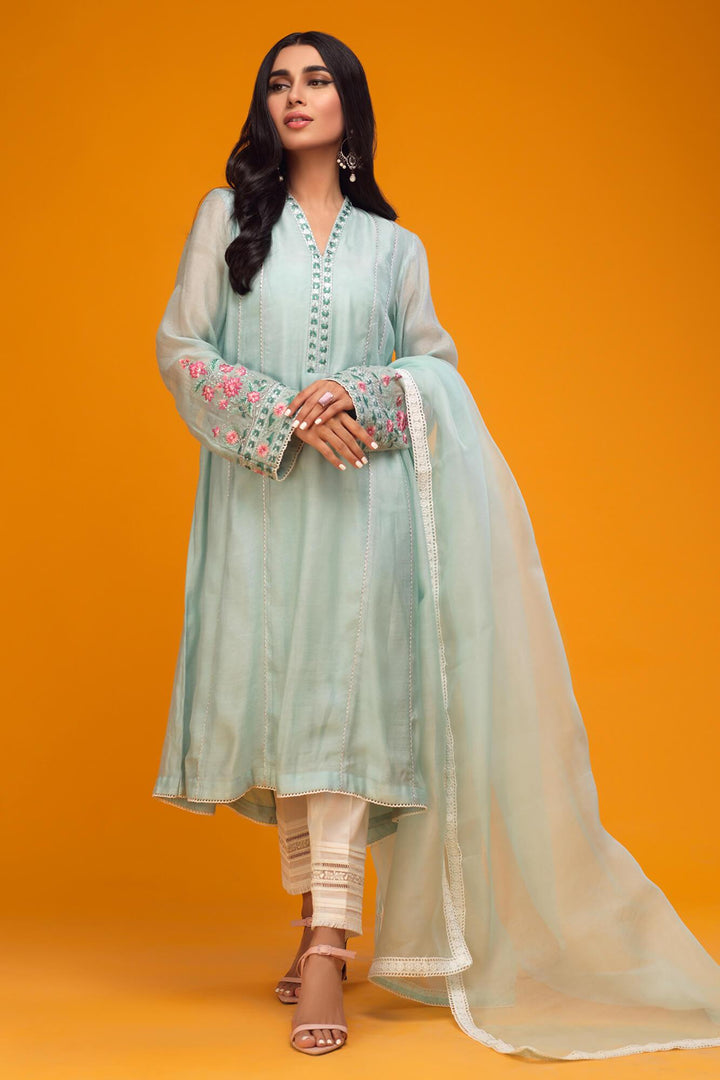 'Frozen Lake' is a creative Iceblue khaadi net flarred dress with beautiful colorful embroidery and lace embellishment. It?s perfect for party & evening wear. Dress it up with our beautifully laced embellished organza dupatta. A must have in your wardrobe.