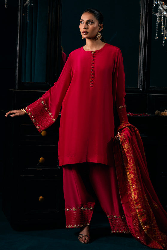 'This Fuschia, chic, silk short shirt paired with a flared shalwar creates a stylish silhouette. Adorned with intricate hand embroidery, including gotta, cut dana, sequins, naqshi, and pearls, it exudes opulence. The tissue silk dupatta, with exquisite screen printing and delicate hand-touch detailing, enhances its grace and sophistication.