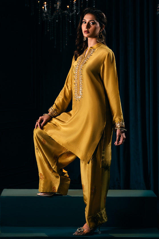 This exquisite mustard green outfit features intricate hand embroidery with gotta, cut dana, pearls, sequins, and dabka work. The short shirt pairs with a flared shalwar, adorned with a screen print and subtle handwork. The delicate net dupatta, finished with fine lace detailing, adds a graceful touch.