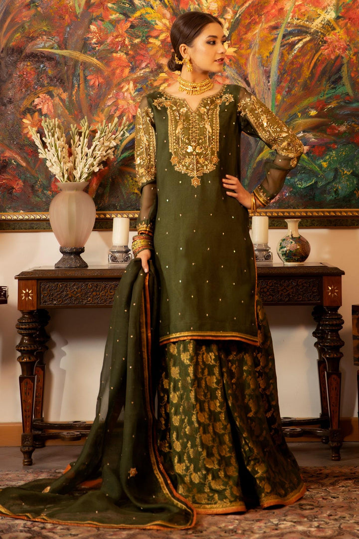 'Haryali Bano' is a straight Ready To Wear Online three piece Luxury Formal Women Suits comes in army green organza fabric. It is adorned with hand crafted complementing kora, dabka and sequins work all over the shirt front and back, paired with a flowy banarsi lehenga with lace finishings and organza dupatta complemented with a stunning rust banarsi.