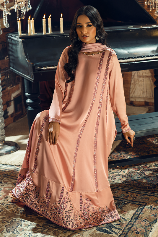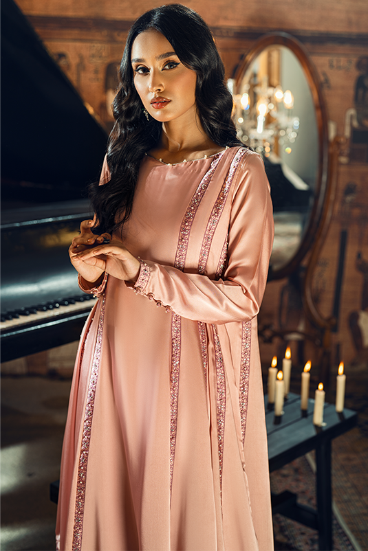 "Hathor" is a satin silk kalidar in Tea pink with 3 colored screen printed border. Sleeves adorned with pearl detailed handmade buttons. It is paired with matching silk flared pants. This look is completed with a matching tissue silk dupatta finished with a lace border and sequins spread over it.