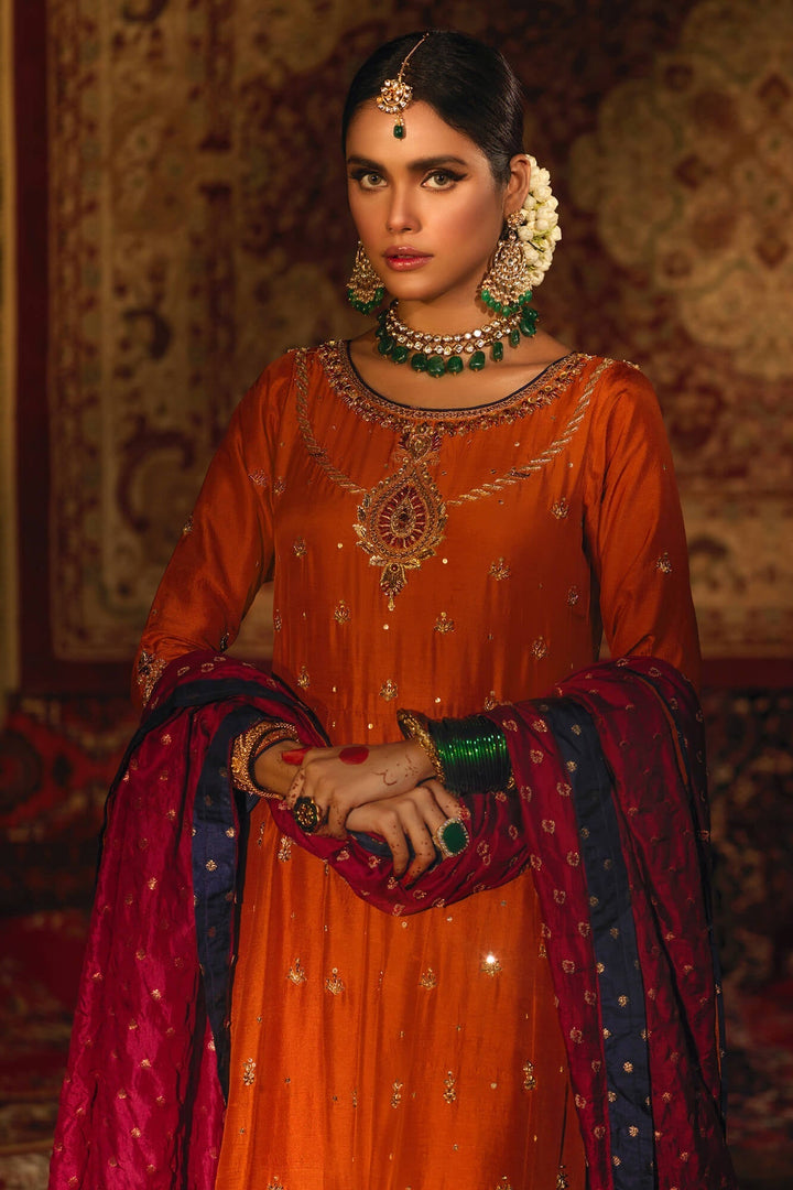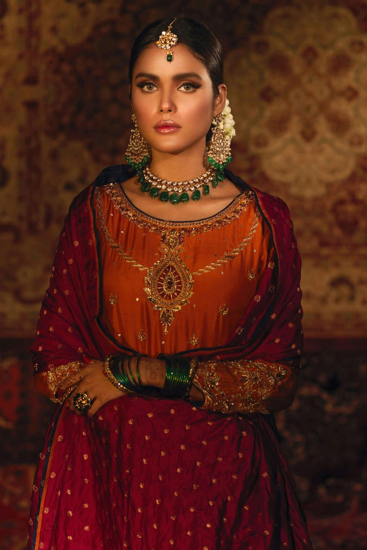 'Itr' is a royal ensemble with a timeless appeal. The vibrant rust hue of the heavily flared kalidaar gives a luxurious feel, further enhancing the delicate handwork of gemstones, zardozi and aari on aesthetically composed damask and jewelry motifs on the neckline, daman and sleeves. The accents of pink and blue, with cutwork on daman and pleated net finishing adds to the opulence of the ensemble outline zari border is given at the back. The frock is paired with a contrasting cherry pink pure banarsi silk dupatta with embroidered tassels on corners. The look is complete with raw silk rust churidar and an embroidered rust pouch with doori- tassel finishing which can be separately ordered from separates section.