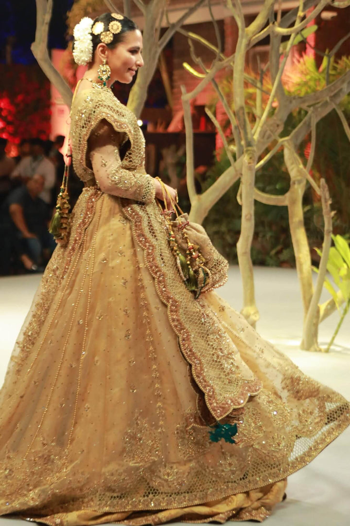 ?Jashn? a royal ensemble, intricately hand embroidered with florals of kora, dabka and stone work all over the outfit. The floor length, trail kalidar is delicately composed on beautiful gold tissue net fabric. It stands out with its royal handcrafted cutwork all over the flare of the kalidar. It is complemented with a gold banarsi lehenga, hand embroidery with stunning scallops all over the hemline. Its paired with fully embellished dupatta with embroidery and cutwork, finished with a deep copper banarsi fabric. The overall bridal look is complemented with an embellished handcrafted pouch with heavy hand crafted tassels, for some traditional vibes.