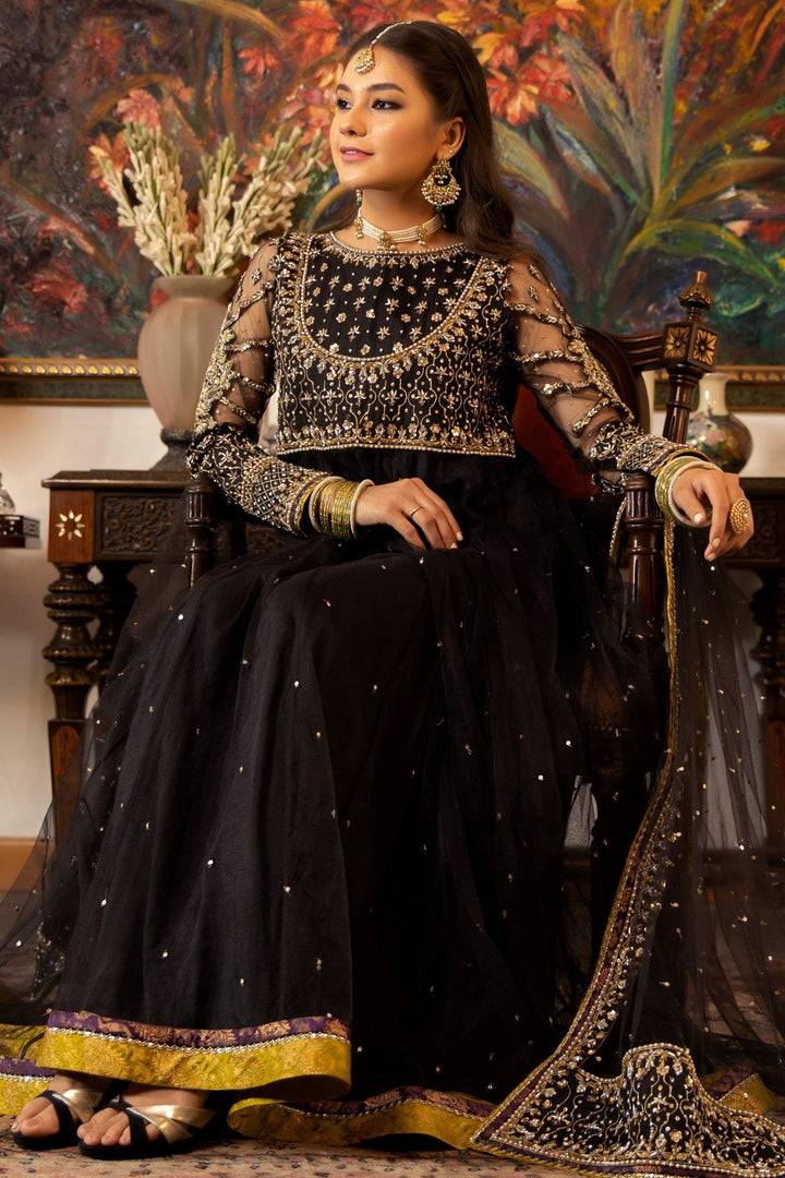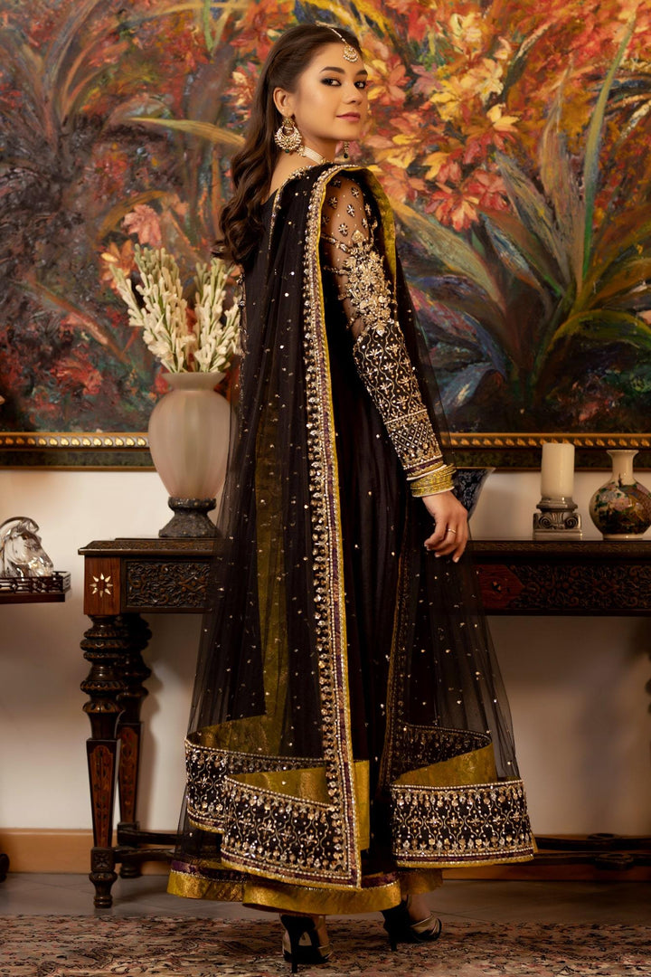 'Kala Sha Kala' is a Luxury Formal Women Three Piece Dress in Black net adorned with hand Embellishments, beautifully encrusted with silver and gold Kora Dabka. It is paired with a heavy dupatta with embroidered borders and scattered sequins finished with purple and green banarsi with black raw silk straight pants.