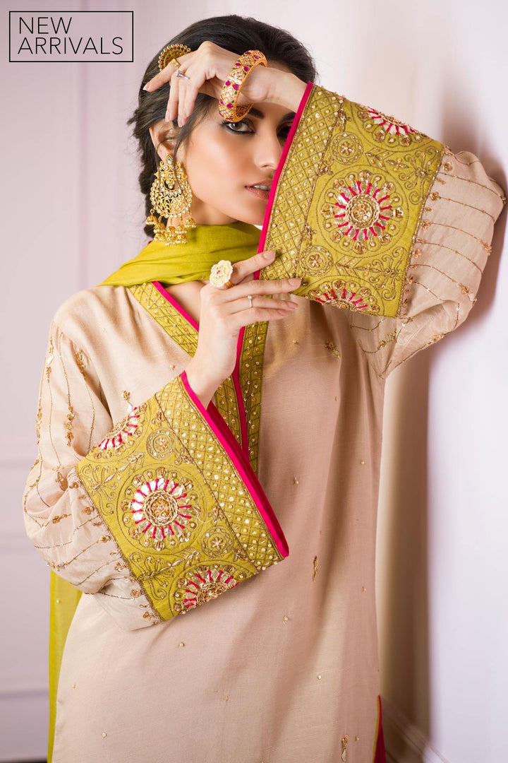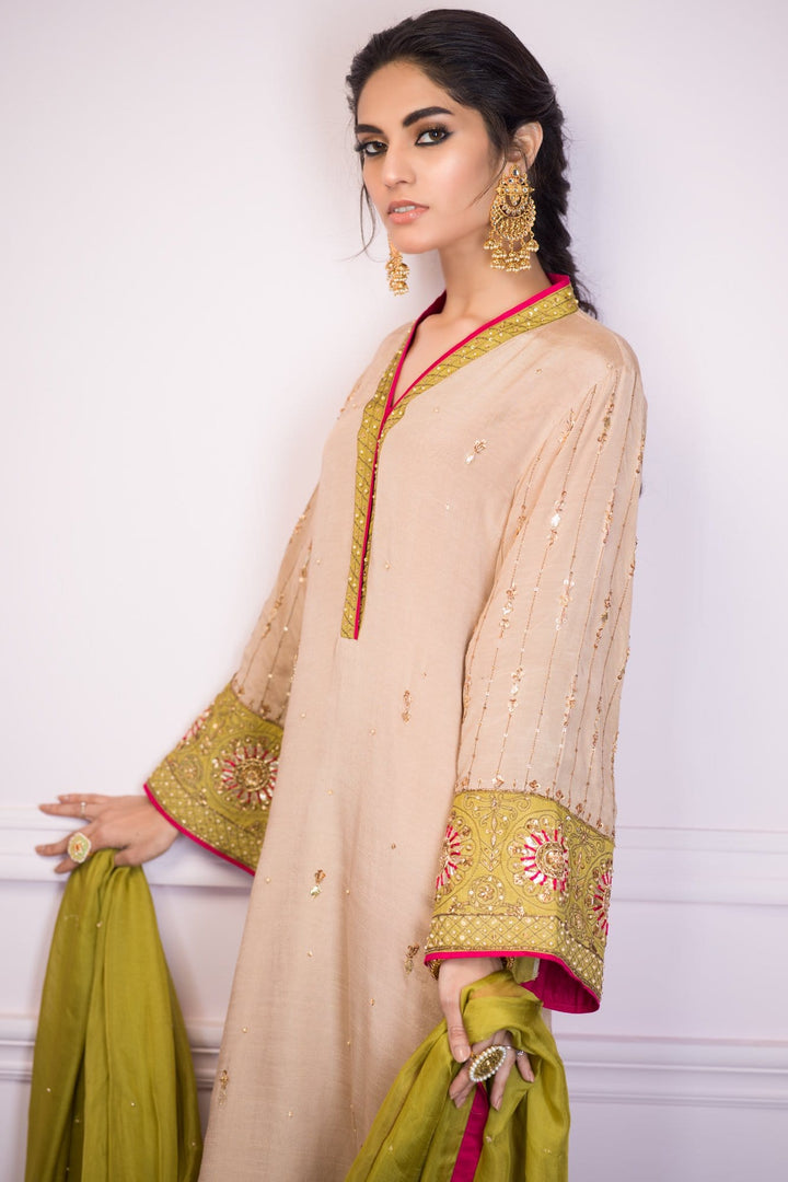 'Kangan' is a classic raw silk outfit in beige with lime green applique work. The handwork is delicately done with kora, dabka, gota, moti, aari and resham with applique. It is paired with matching raw silk straight pants with handwork of aari and sitara to enhance the look and a contrasting tissue silk lime green dupatta with pearls chan and handmade fabric tassels. The outfit is finished with pink and lime green finishing.