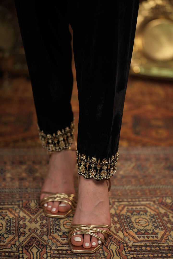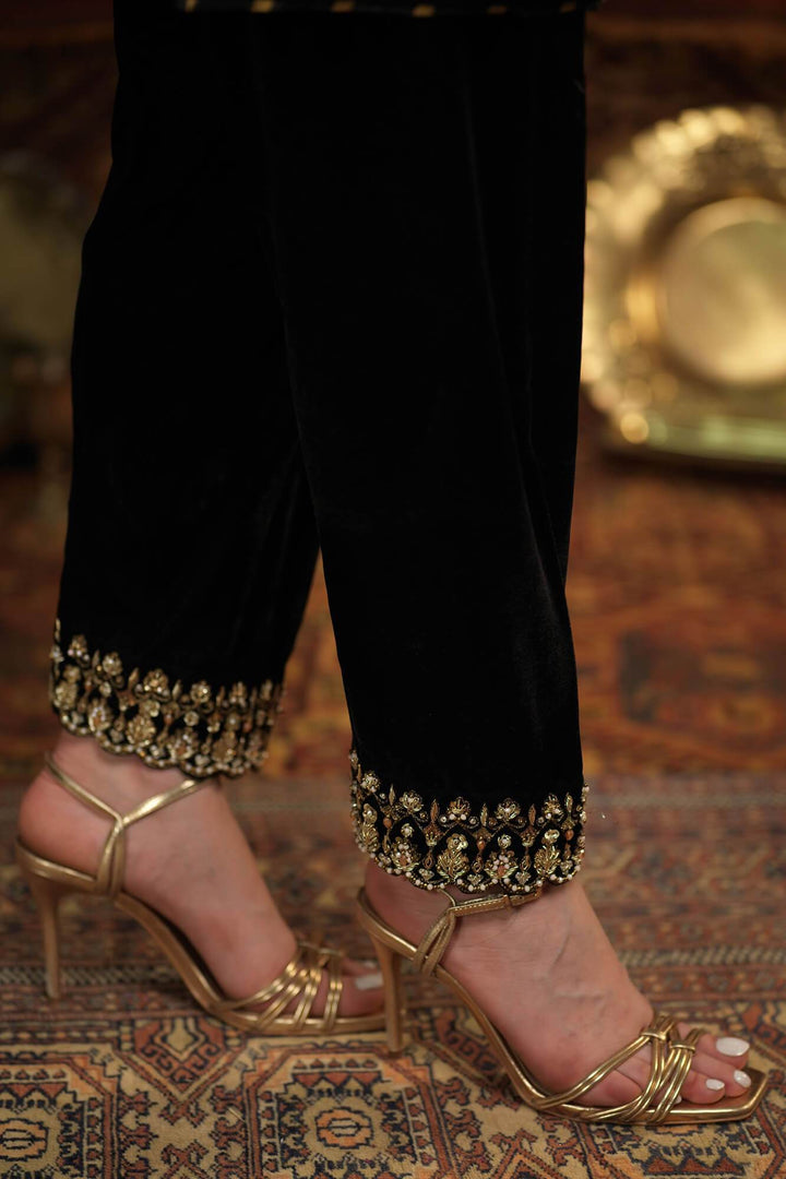 Koel velvet shalwar is hand embellished with kora,dabka,aari and zari.