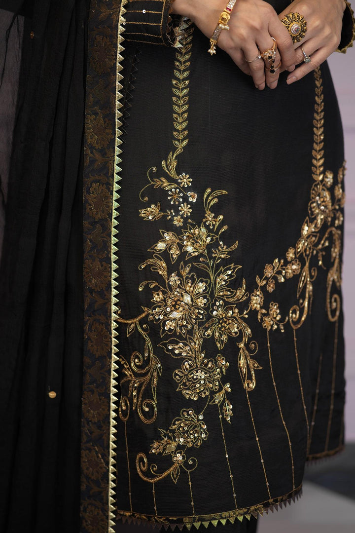 ?Kohinoor' in black raw silk is a sophisticated ensemble with a straight silhouette . The front and sleeves are intricately hand embroidered with meticulous aari, zardozi and gota work in gold and copper. It has been paired with a black chiffon dupatta with chan and raw silk straight pants. The look has been completed with kingri and banarsi finishings on shirt and dupatta.