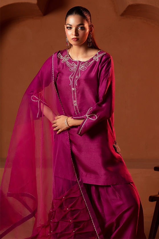 Add a touch of glamour to your wardrobe with our magenta ensemble, intricately embellished with sparkling diamanté. The outfit features a farshi shalwar and an organza dupatta with delicate fabric manipulation and lace trimming, offering both comfort and sophistication.