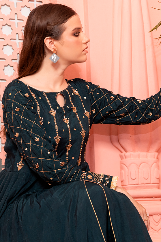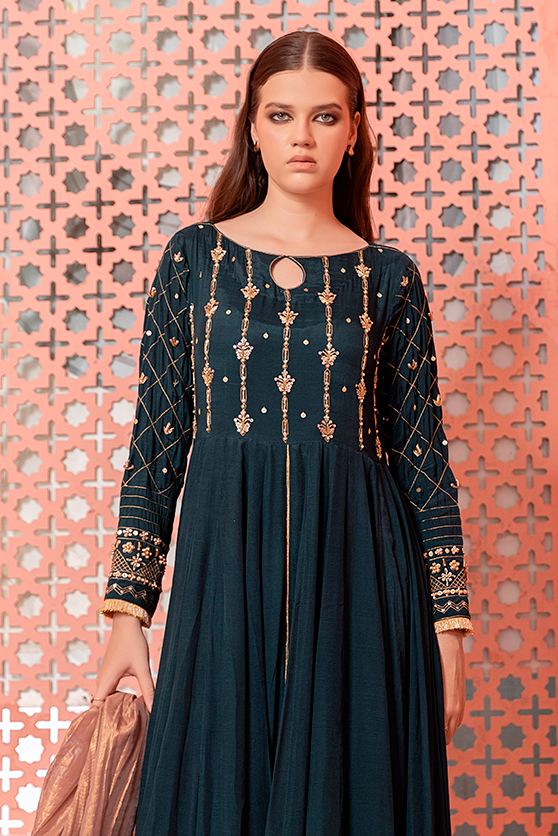 "Miray" is a front open green peshwas with hand embroidery. The stunning front bodices, sleeves and border has a detailed and embellished with dabka, kora ,sequence ,crystal and pearl work. It is paired with matching straight pant and copper masuri dupatta with kiran trimmings.