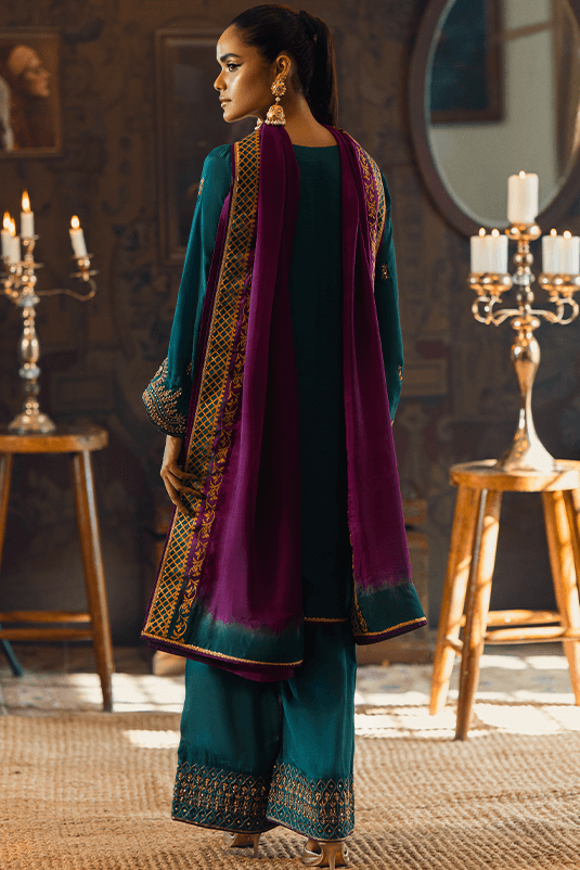 "Nahal" is a PK raw silk green kurta with intricate zardozi work in the front and on the sleeves. It is embellished with pearls, sequins, crystals and contrasting purple resham. The neckline is finished with buttons to complete the look. The culottes are finished with hand embroidered borders. It is paired with a two-colored dupatta in contrasting colors purple and green, with heavy embroidery on the pallu to complete the look.