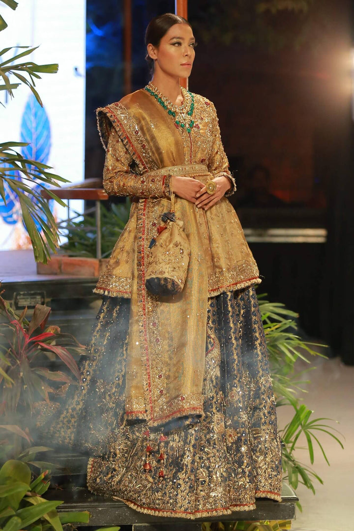 Naseeban is a beautiful bridal dress in gold front style peplum, with delicate handwork with touching of maroon color which is highlighted with royal blue and maroon banarsi finishing and fray lace. It is paired with a royal blue banarsi lehenga with bird motifs that elegantly uplifts the festive bridal outfit. A matching gold tissue dupatta with blue banarsi finishing and tassels with intricate handwork and stunning handmade tassels. It is paired with a stunning pouch in gold tissue net with floral and figurative motifs along with hand made delicate tassels.