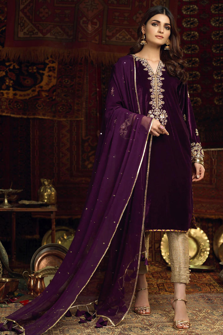 "Sitara" a beautifully handcrafted velvet outfit in deep purple creates aesthetic magic with intricate work of gota, moti, kora, dabka, zari and aari. The shirt is paired with a deep purple pure chiffon handwork dupatta with hand embellished finishing.