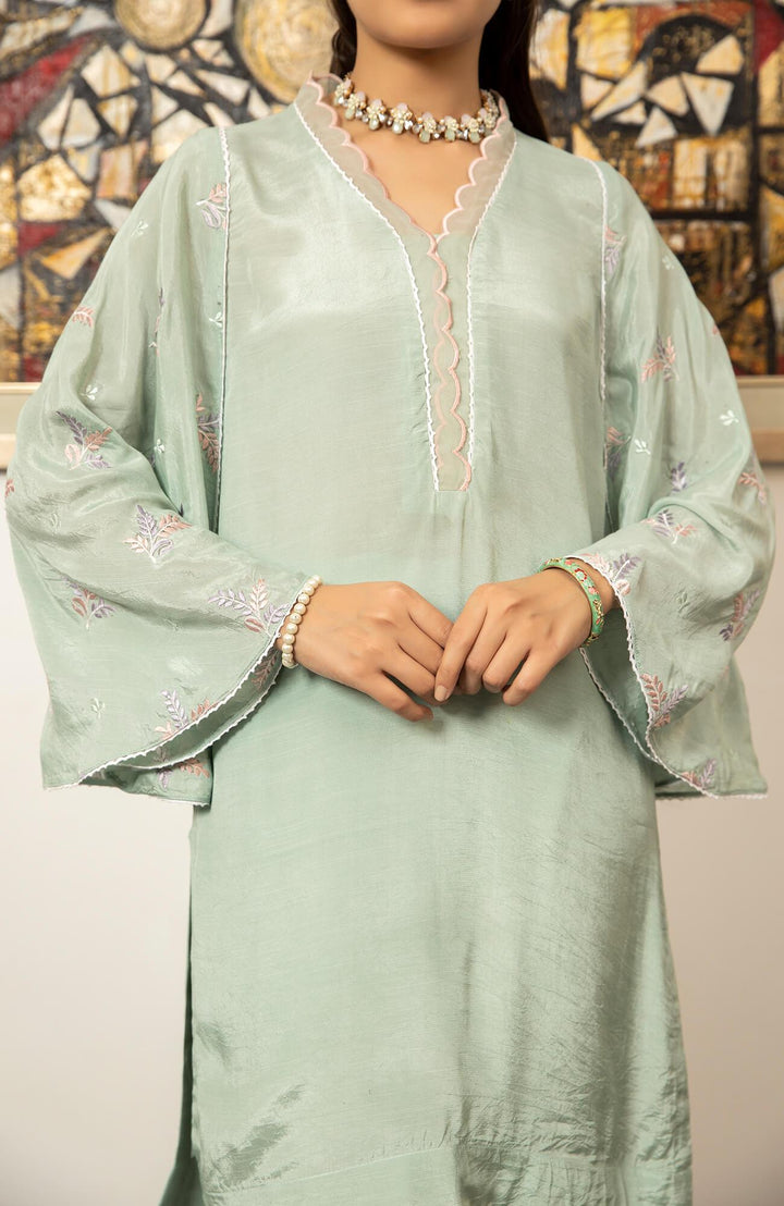 'Snowdrop' is a ice blue pk raw silk shirt stylized with a scalloped organza neckline and embroidered flared sleeves paired with scalloped straight pants to give you a light airy feel perfect for this season.