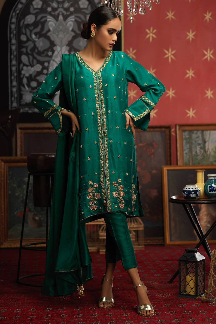 'Tazeen' is a pk raw silk emerald green front open shirt, meticulously hand embellished in gold and a touch of hot pink resham infused with kora, zari and dabka, it is a symmetrical embroidery. It is paired with a pure silk dupatta with gold lace finishing and tassels on four sides.