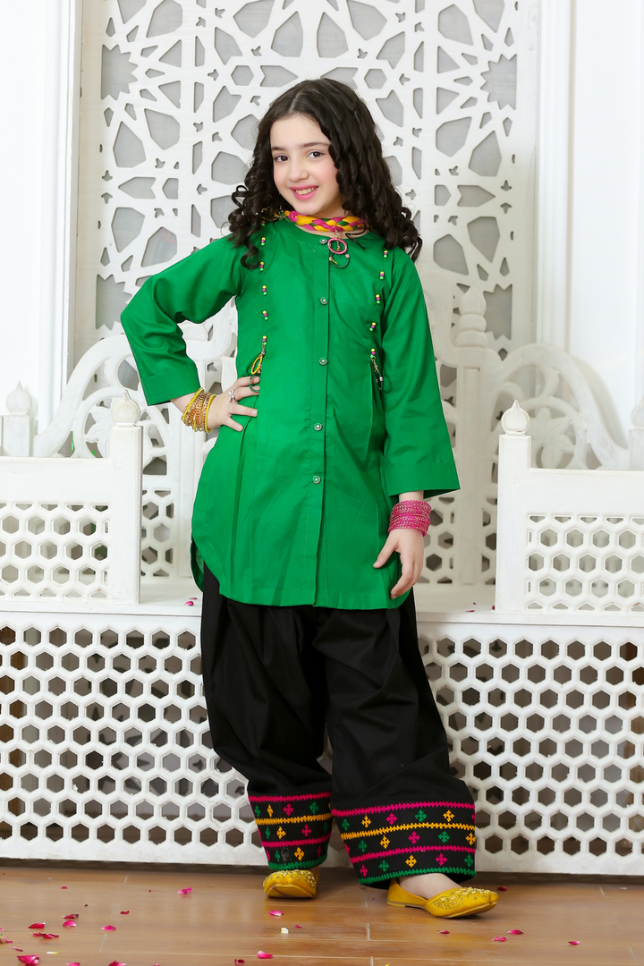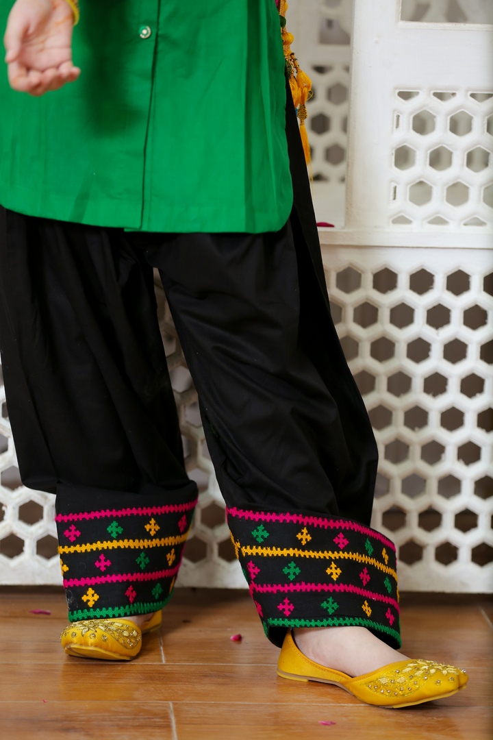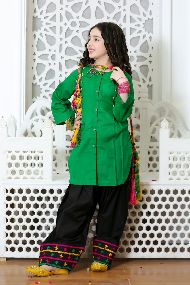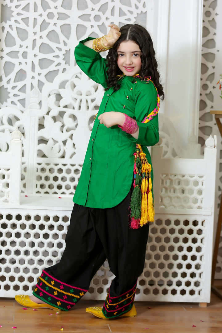 3 piece dress having Green Soft Cotton Shirt Embellished with coloured Beads on front with circle tassels, , with Black Farshi Shalwar with unique Sindhi Hand embroidery includes Multi colored parranda embellished with Tassels