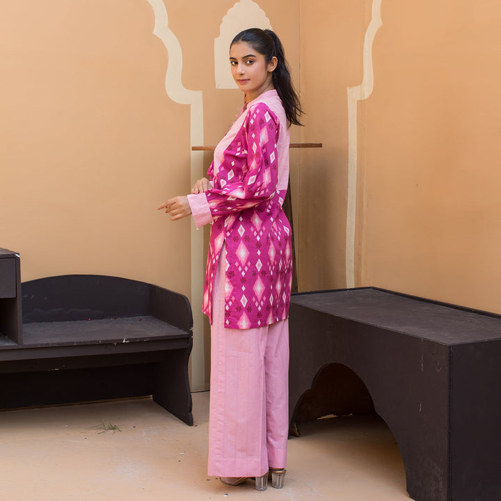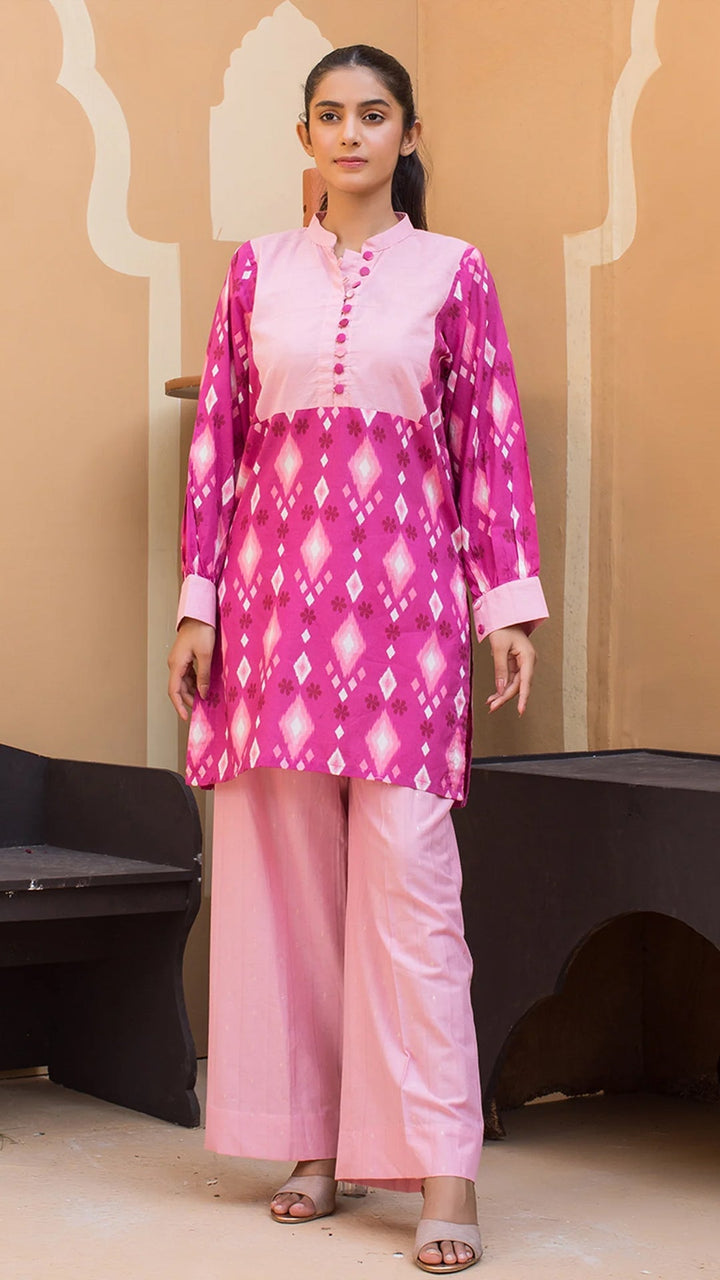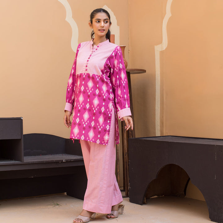 | Pink Print with Solid Patch! With its intricate print details and button detailing, you'll be the center of attention wherever you go. This long dress is not only stylish but also perfect for any occasion. Dive into fashion with this must-have piece! |