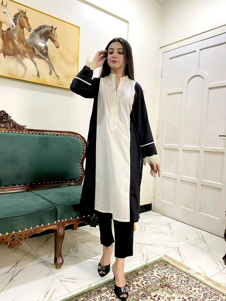 Our 1-piece shirt features stunning embroidery lace on sleeves, showcasing intricate detailing. The shirt is adorned with beautiful Cream and Black contrast, and perfect stitching. The sleeves include pleats and cutwork lace work, adding a touch of elegance. The contrast color combination makes this piece truly stand out.