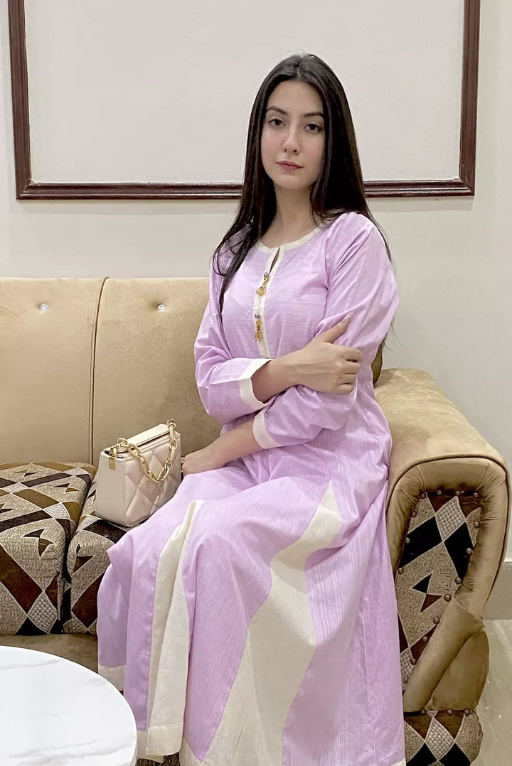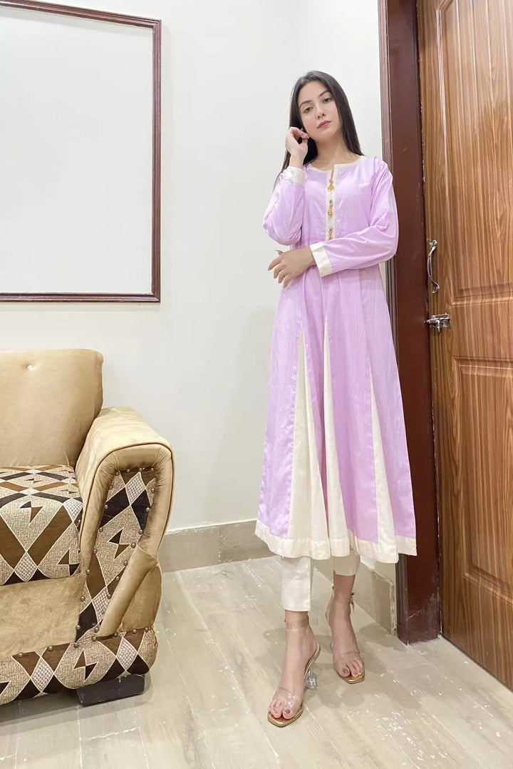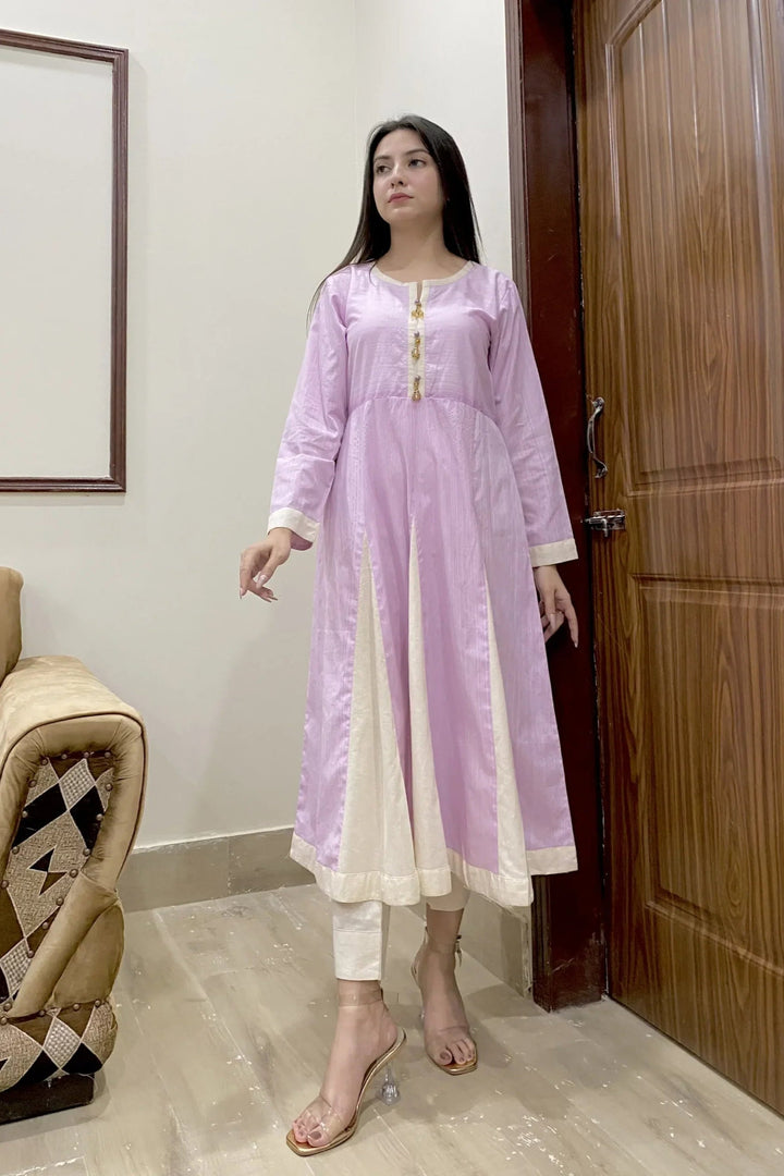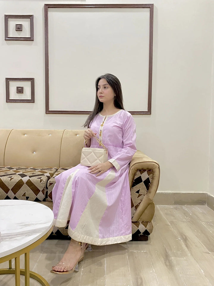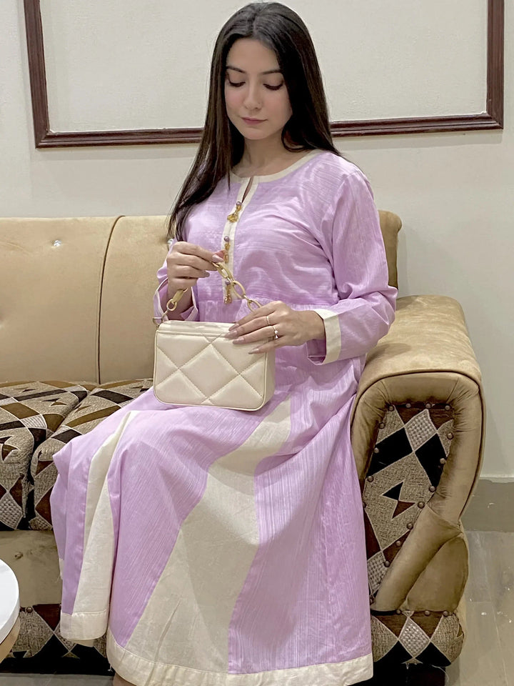 1 Piece Frock - Cream Patches on stripe printed pruple for more grace / three set of pearls at placket