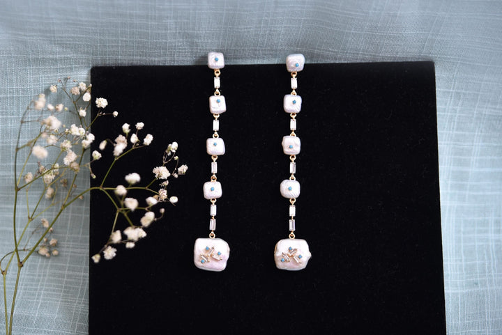 These lovely long danglers are interconnected, to elevate the chic perfection. The square pearls connecting with sparkly baguettes and turquoise that ends with the big square pearl, is all you need for the perfect glam.