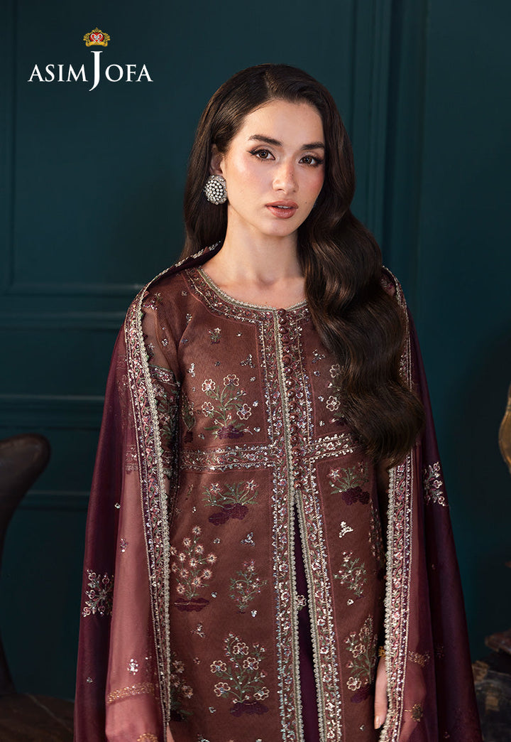 Drenched in the soft allure of maroon, this ensemble redefines elegance with its front-open jacket style shirt. The design is enriched with light gold zari and sequins, intertwined with sage green, plum, and dull pink threadwork that creates a symphony of delicate hues. The dupatta in a deep maroon shade is beautifully embroidered with grand motifs scattered across its expanse, offering a statement of artistry. Paired with elaborately embroidered trousers that add a modern edge, the look is immaculate for any celebratory occasion.