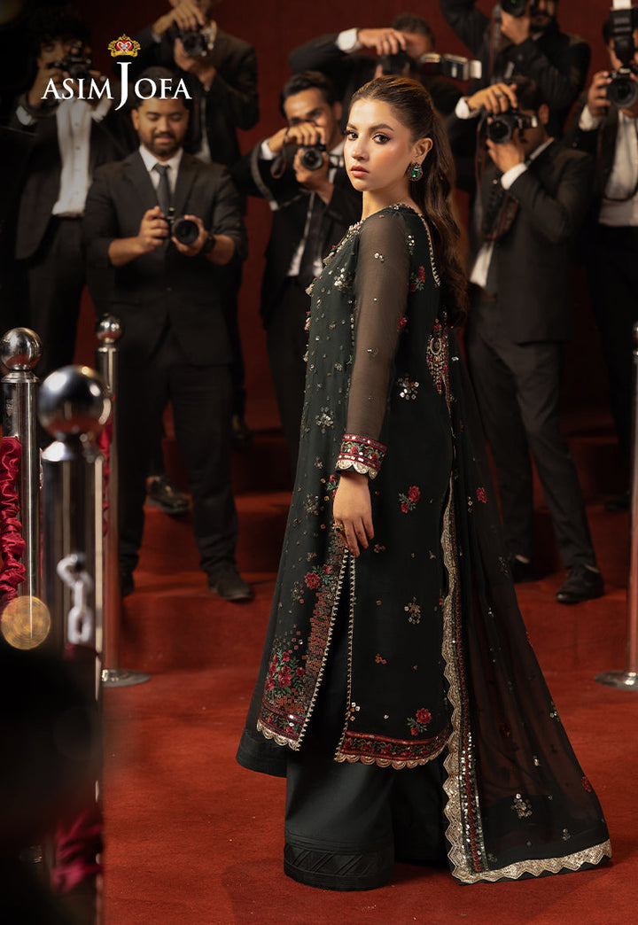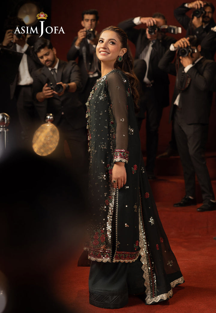 Like a midnight garden touched by moonlight, this deep green ensemble is a visual symphony of texture and color. The shirt shimmers with multi-sized light gold sequins, catching the light at every turn, while maroon, red, and bottle green threadwork weaves depth and richness into the design. The look is completed with an embroidered dupatta, where rose-inspired motifs bloom softly across the fabric—echoing the allure of a timeless floral melody.