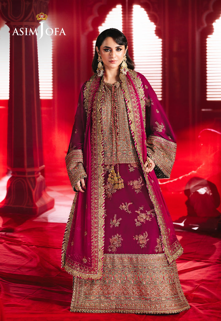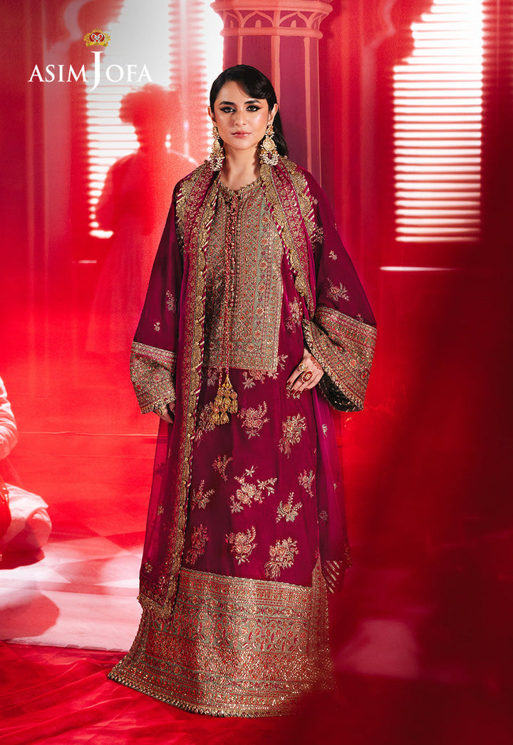 Drenched in the regal allure of magenta, this opulent ensemble is a testament to timeless elegance. The velvet shirt features embroidered neckline, border and sleeves on silk, adorned with a canvas of deep gold zariwork, shimmering with the brilliance of 5mm cupped sequins, while intricate magenta and vibrant rust threadwork intertwine to create a symphony of color and texture. Complemented by an exquisitely embroidered dupatta, this masterpiece exudes an air of grandeur, making it a flawless choice for those who seek to embody grace and sophistication.